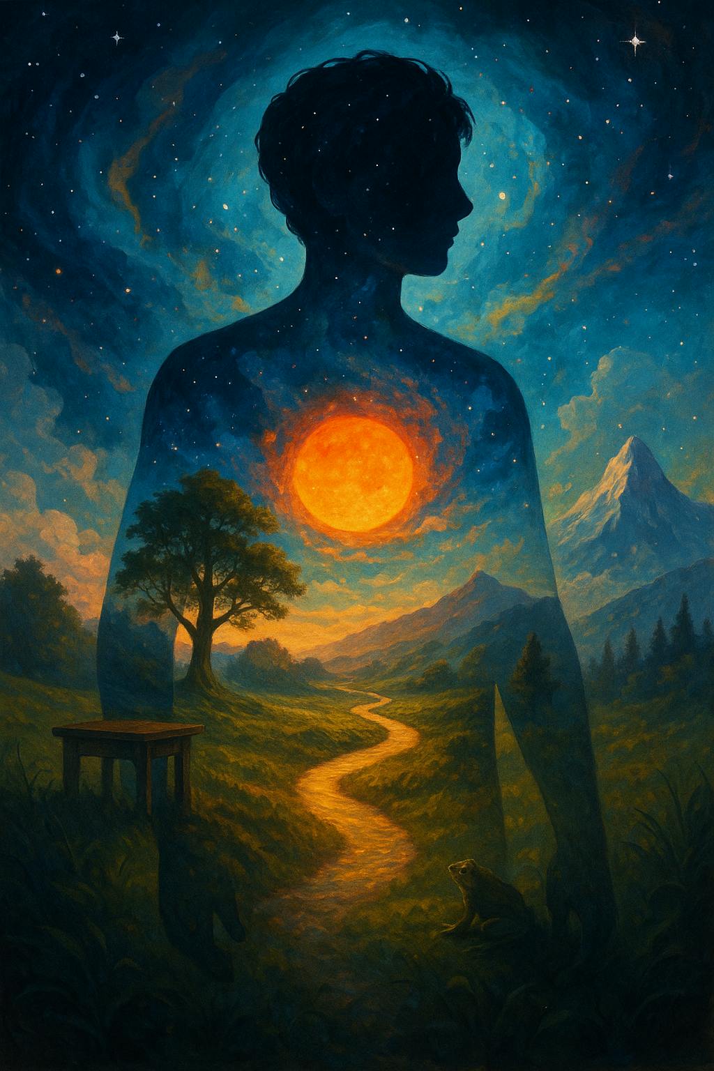 Una frase espiritual que sugiere que cada persona es una expresión del universo mismo, en constante cambio y flujo.